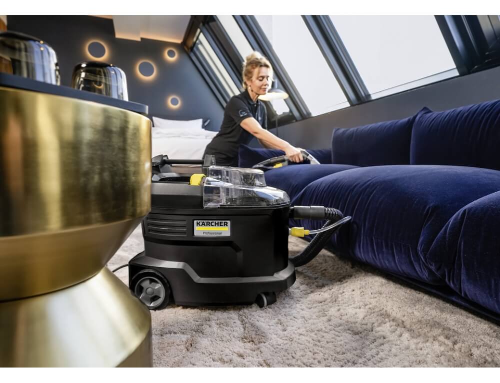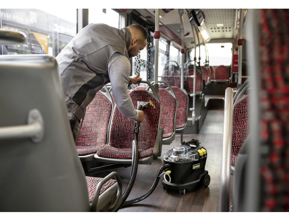 Η σκούπα ψεκασμού-αναρρόφησης Puzzi 8/1 Go!Further, κατασκευασμένη από 44% ανακυκλωμένο πλαστικό, συνοδεύεται από αποκλειστικά εξαρτήματα και ένα μπουκάλι 1 λίτρου καθαριστικού RM 764N OA. Το μηχάνημα προσφέρει υγιεινά αποτελέσματα καθαρισμού κατά τον καθαρισμό υφασμάτινων επιφανειών και την αφαίρεση λεκέδων από υφασμάτινες επιφάνειες και εντυπωσιάζει με την υψηλή οικονομική αποδοτικότητά του. Η καθαριότητα σε βάθος επιτυγχάνεται με τον ψεκασμό του καθαριστικού διαλύματος βαθιά μέσα στις ίνες και στη συνέχεια με την αναρρόφηση της βρωμιάς που έχει χαλαρώσει. Η αποτελεσματική αναρροφητική ικανότητα επιτρέπει επίσης γρήγορο στέγνωμα και γρήγορη χρήση των επιφανειών. Το μηχάνημα ικανοποιεί έτσι τις υψηλές απαιτήσεις των επαγγελματιών καθαρισμού στον ξενοδοχειακό και εστιατορικό κλάδο, καθώς και στον καθαρισμό εσωτερικών χώρων οχημάτων. Το στάνταρ, εξαιρετικά κοντό ακροφύσιο υφασμάτινων επιφανειών διευκολύνει τον καθαρισμό ακόμη και σε στενούς χώρους. Το χαμηλό βάρος σε συνδυασμό με την εργονομική λαβή μεταφοράς επιτρέπει την εύκολη μεταφορά με το ένα χέρι. Το διαφανές κάλυμμα του μηχανήματος και το ακροφύσιο χειρός παρέχουν καθαρή θέα στο βρώμικο νερό.