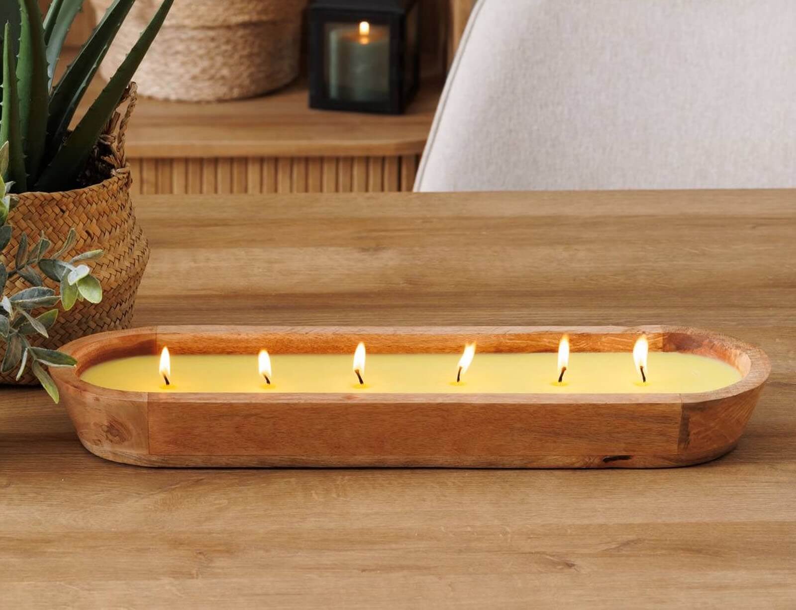 Διακοσμήστε και δώστε λάμψη σε κάθε δωμάτιο με το αρωματικό κερί από την Atmosphera. Με το ιδιαίτερο άρωμά του θα γίνει το περιβάλλον σας πιο ευχάριστο και χαλαρωτικό. Eίναι τοποθετημένο σε δοχείο από ξύλο μάνγκο, το οποίο θα δώσει μια φυσική και boho νότα στο χώρο σας. Διαθέτει 6 φυτίλια για πιο ομοιόμορφη καύση και διαρκεί περίπου 23 ώρες.