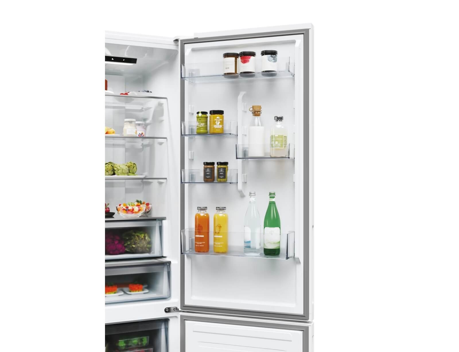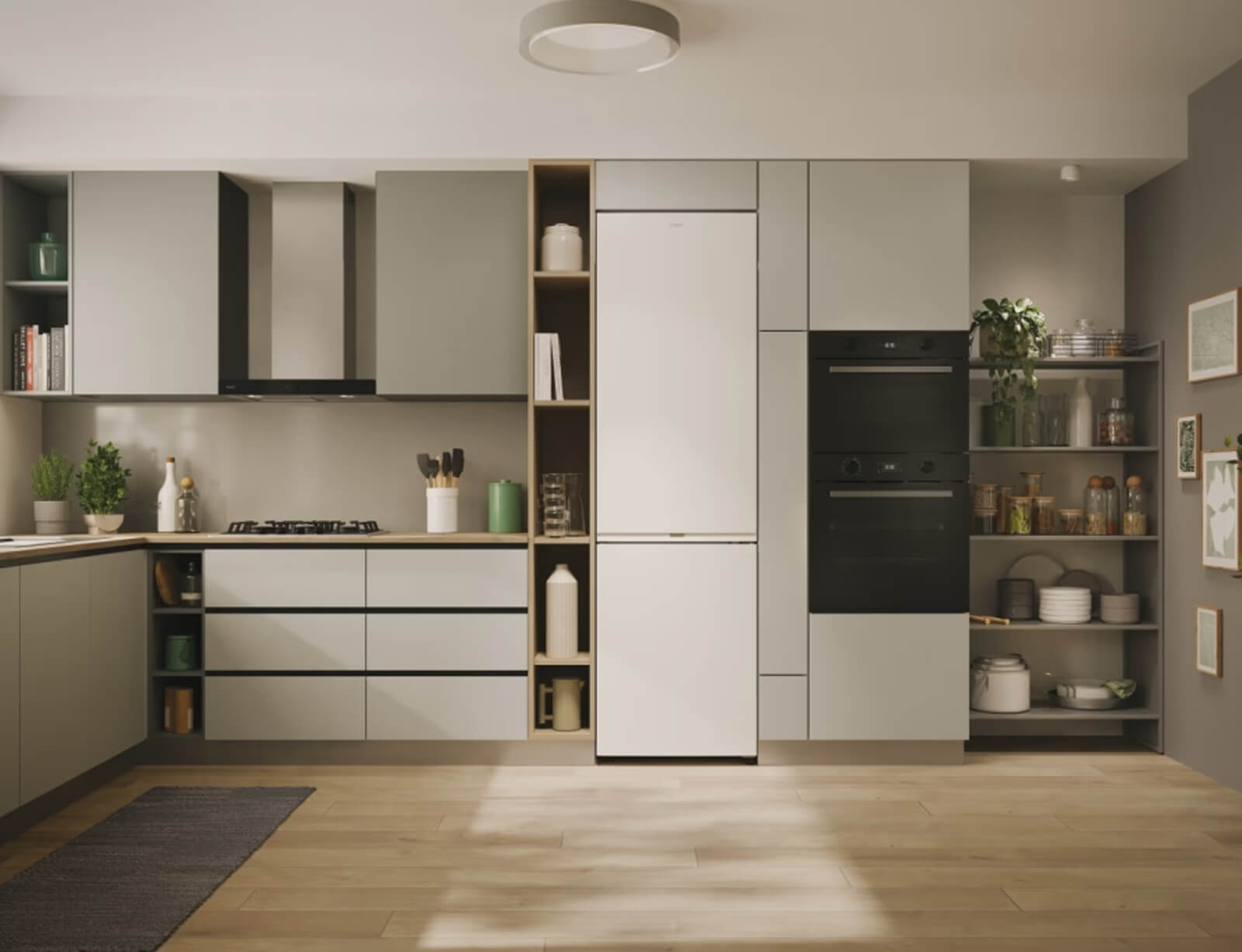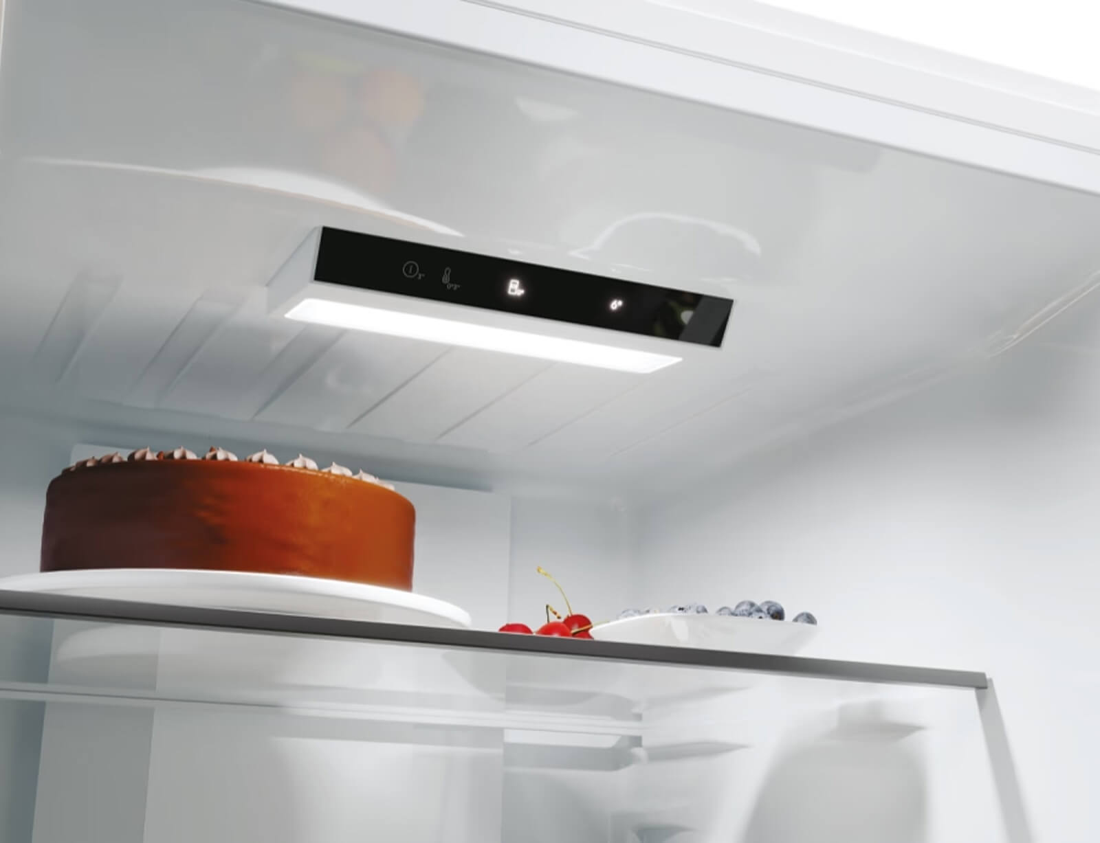 Το ψυγείο ενσωματώνεται τέλεια στο σχεδιασμό της κουζίνας. Οι λαβές και το λουράκι της πόρτας προσαρμόζονται αρμονικά στην επιφάνεια εργασίας, ενώ οι κρυφοί μεντεσέδες επιτρέπουν την ευέλικτη τοποθέτηση με την πόρτα να ανοίγει υπό γωνία 90°.