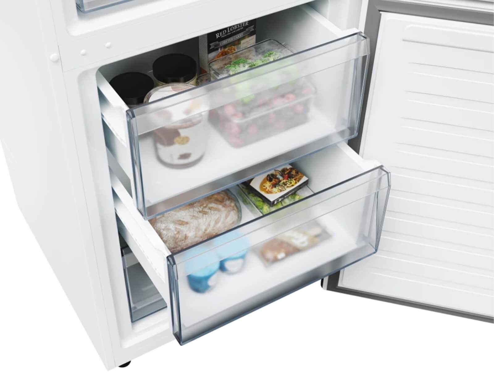 Αυτό το ψυγείο με πλάτος 60 cm προσφέρει εντυπωσιακή χωρητικότητα 409 λίτρων, αρκετή για να αποθηκεύσετε έως και 21 σακούλες με τρόφιμα μετά τα ψώνια. Τα μεγάλα συρτάρια κατάψυξης σάς επιτρέπουν να αποθηκεύετε ακόμη μεγαλύτερα αντικείμενα, εξασφαλίζοντας άνεση και λειτουργικότητα.