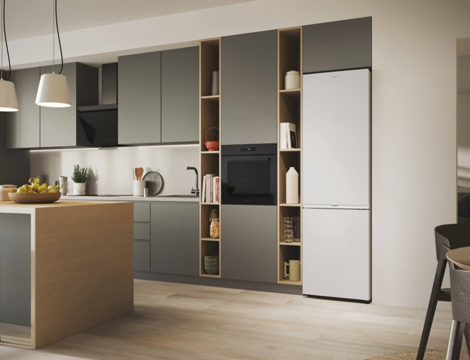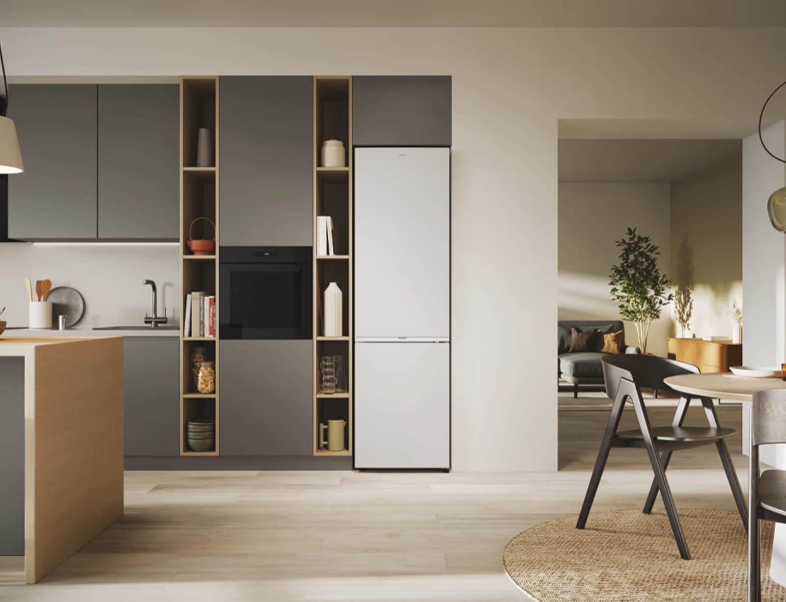 Το ψυγείο ενσωματώνεται τέλεια στο σχεδιασμό της κουζίνας. Οι λαβές και το λουράκι της πόρτας προσαρμόζονται αρμονικά στην επιφάνεια εργασίας, ενώ οι κρυφοί μεντεσέδες επιτρέπουν την ευέλικτη τοποθέτηση με το άνοιγμα της πόρτας υπό γωνία 90°.