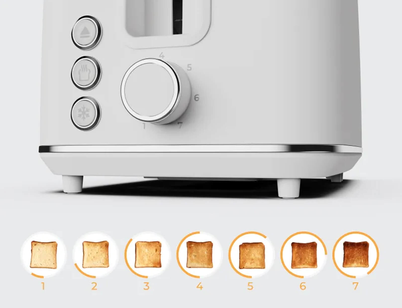 Πετύχετε τη φρυγανιά ακριβώς όπως σας αρέσει — από ελαφριά χρυσαφένια έως βαθιά, τραγανή υφή. Με 7 ρυθμιζόμενα επίπεδα ψησίματος, μπορείτε να εξατομικεύετε κάθε φέτα σύμφωνα με τα γούστα σας, κάθε φορά. Ιδανικό για τα πάντα — από απαλές πρωινές φρυγανιές έως σταθερές βάσεις για σάντουιτς.