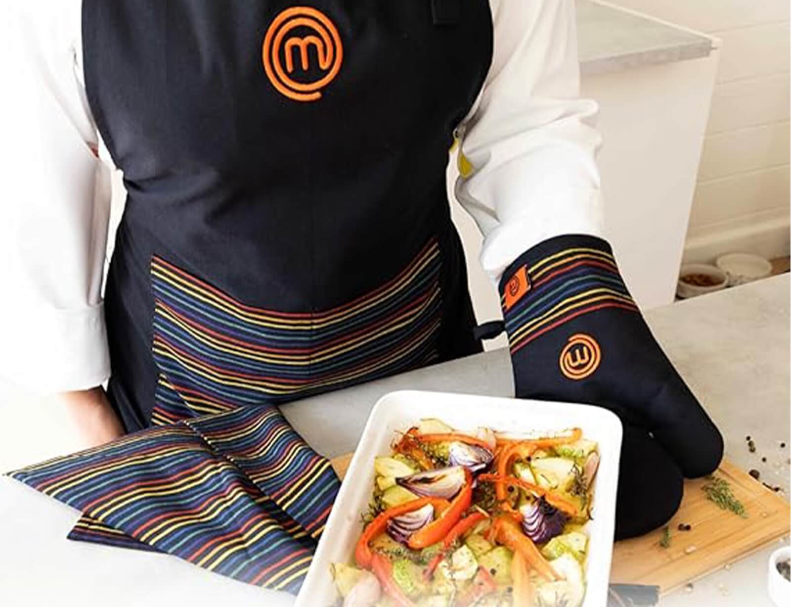 Αυτό το σετ κουζίνας από βαμβακερό ύφασμα υψηλής ποιότητας είναι επίσημο προϊόν της τηλεοπτικής σειράς MasterChef, σχεδιασμένο στη Βρετανία.