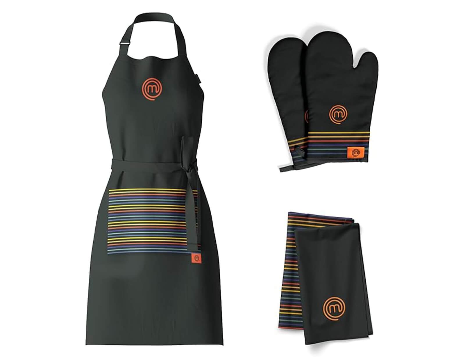 Κάθε κομμάτι αυτού του σετ είναι κεντημένο με το επίσημο λογότυπο MasterChef και διαθέτει επώνυμες θηλιές για βολική αποθήκευση στην κουζίνα.