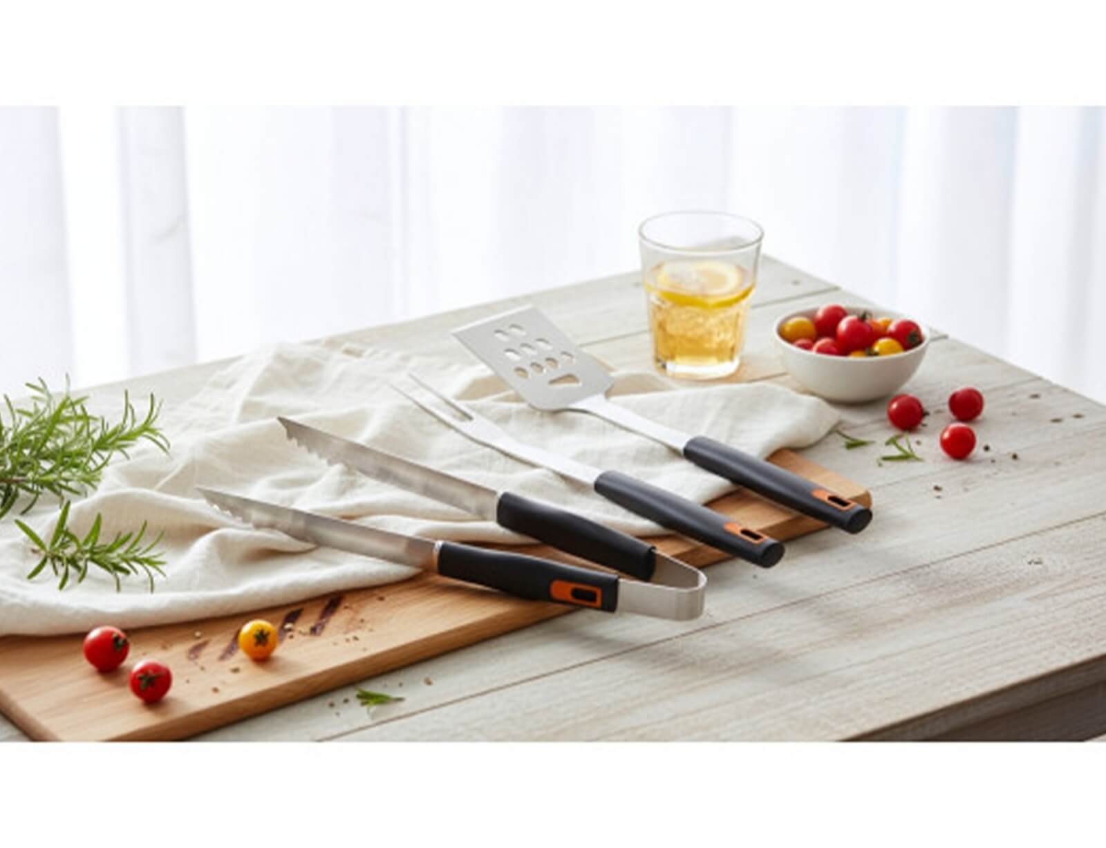 Το σετ αξεσουαρ για μπαρμπεκιου της σειράς Noiranja της MasterChef, περιλαμβάνει μία σπάτουλα, μία λαβίδα και μία πιρούνα. Είναι κατασκευασμένα από ανθεκτικά υλικά με εξαιρετική αντοχή στη θερμότητα. Ένα ιδανικό σετ για μπάρμπεκιου στο σπίτι ή επαγγελματική χρήση.