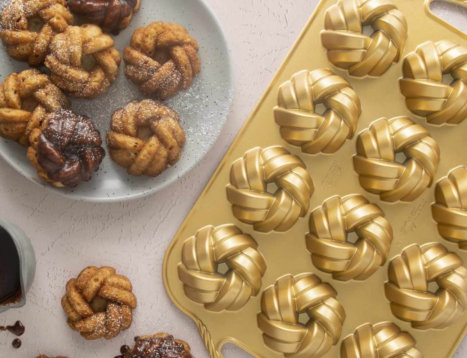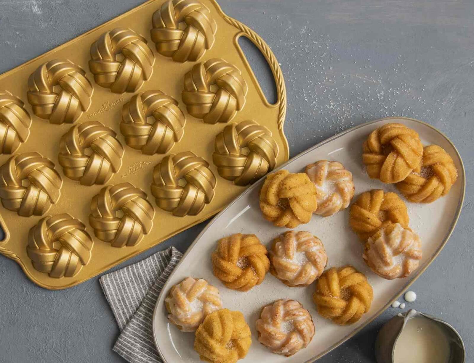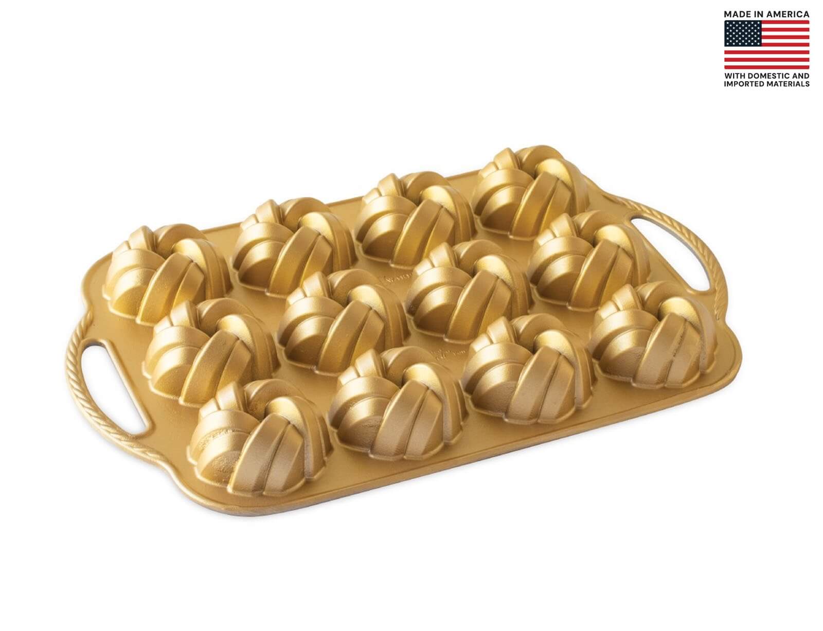 Φόρμα για 12 μικρά κέικ Nordic Ware Premier Gold 75th Anniversary σε πλεκτό σχήμα, με τρύπα και διαστάσεις 38x25x4cm