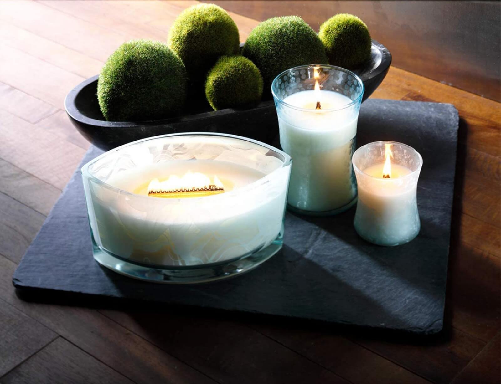 Το αποκλειστικό ξύλινο φυτίλι Pluswick® δημιουργεί απαλό ήχο τριξίματος και χορευτική φλόγα, ενώ ο φαρδύς σχεδιασμός του δοχείου επιτρέπει τη δημιουργία πλήρως λιωμένης επιφάνειας κεριού για πιο ομοιόμορφη και σταθερή διάχυση του αρώματος σε όλο τον χώρο.