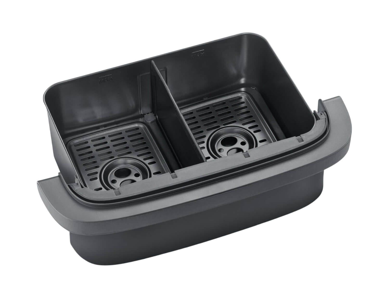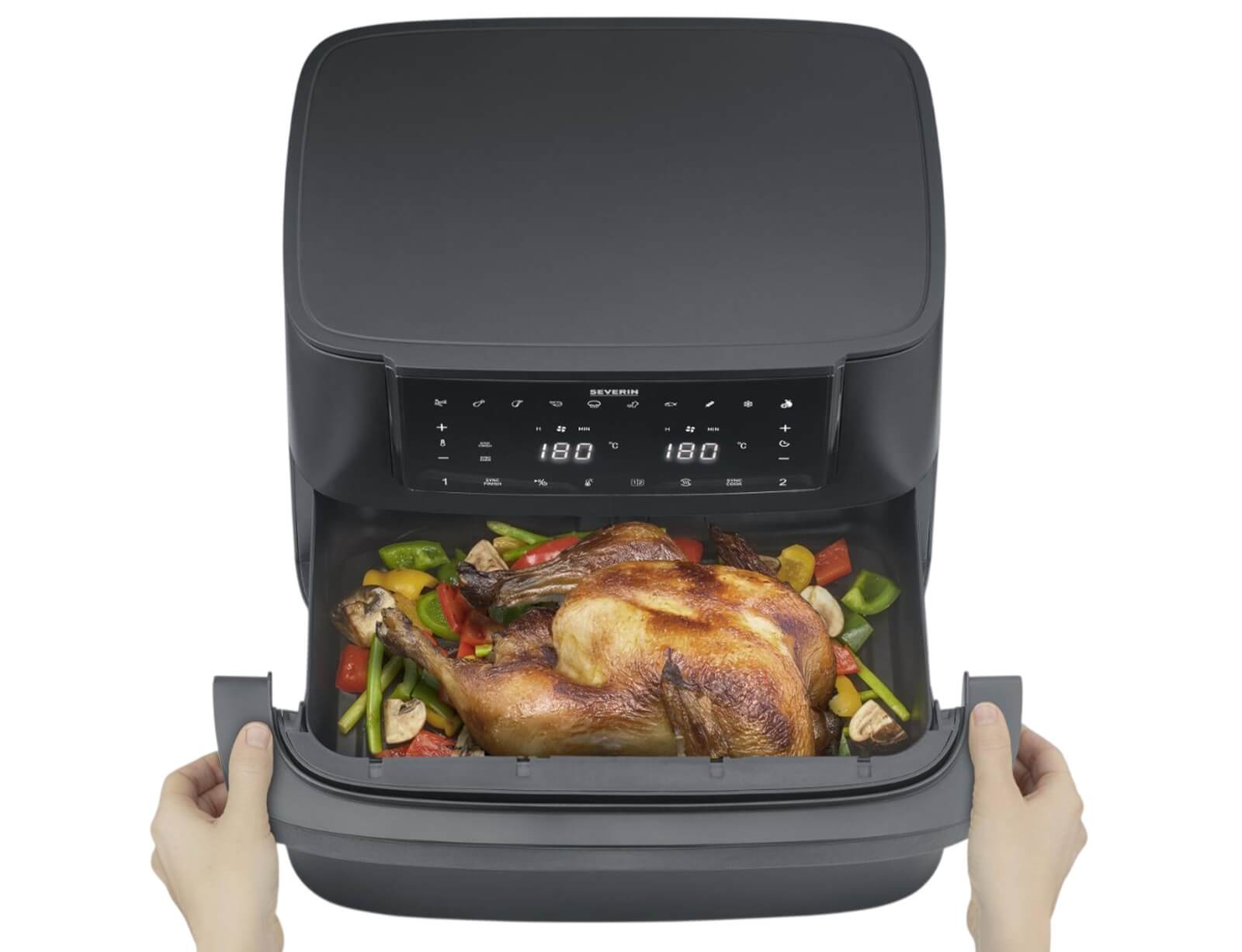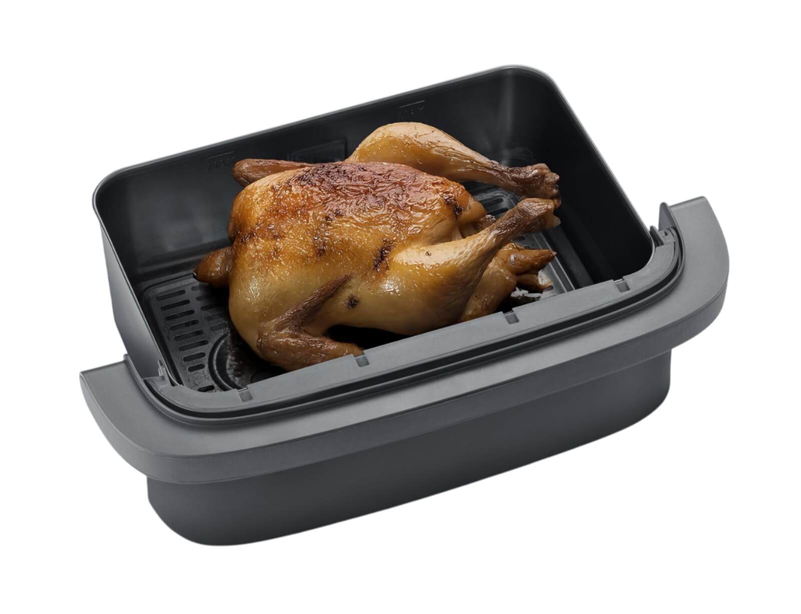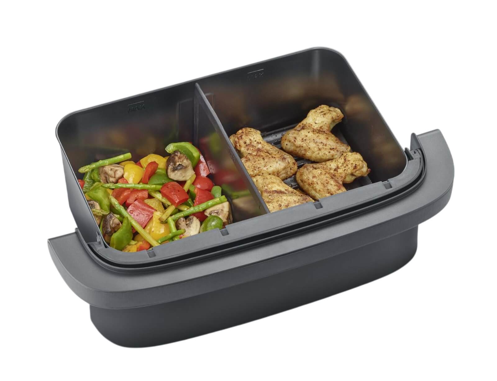 Αυτό το μοναδικό μοντέλο διαθέτει έναν εύκαμπτο κάδο που σας δίνει την επιλογή να το χρησιμοποιήσετε ως ένα, έτσι ώστε να έχετε χωρητικότητα 9 λίτρων. Ή επιλέγετε την έξυπνη λύση εύκαμπτου κάδου και κατεβάζετε τον διαχωριστή και έχετε 2 κάδους με ξεχωριστό χειριστήριο, που επιτρέπει το ταυτόχρονο μαγείρεμα διαφορετικών πιάτων με διαφορετικές θερμικές επιδράσεις. Η νέα λειτουργία SYNC διασφαλίζει ότι αυτό που μαγειρεύετε στα διαφορετικά καλάθια είναι έτοιμο ταυτόχρονα, ακόμα κι αν οι χρόνοι μαγειρέματος είναι διαφορετικοί!