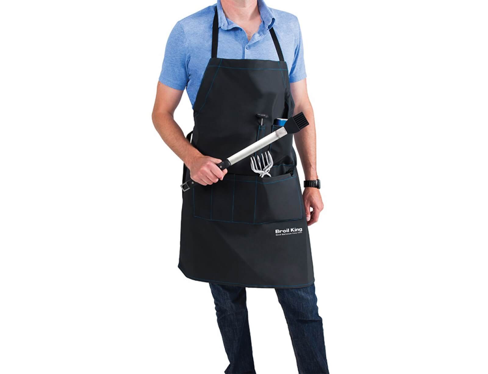 Η ποδιά Broil King είναι κατασκευασμένη από το ίδιο αδιάβροχο υλικό όπως και τα καλύμματα της Broil King. Προσφέρει προστασία από τα λίπη και τα λάδια και καθαρίζεται πολύ εύκολα. Περιέχει ανοιχτήρι μπουκαλιών, θήκη για το θερμόμετρο, για το αναψυκτικό σας και για διάφορα εργαλεία ψησίματος. Διαθέτει ρυθμιζόμενο λουρί λαιμού και μέσης για να την προσαρμόσετε στα μέτρα σας.
