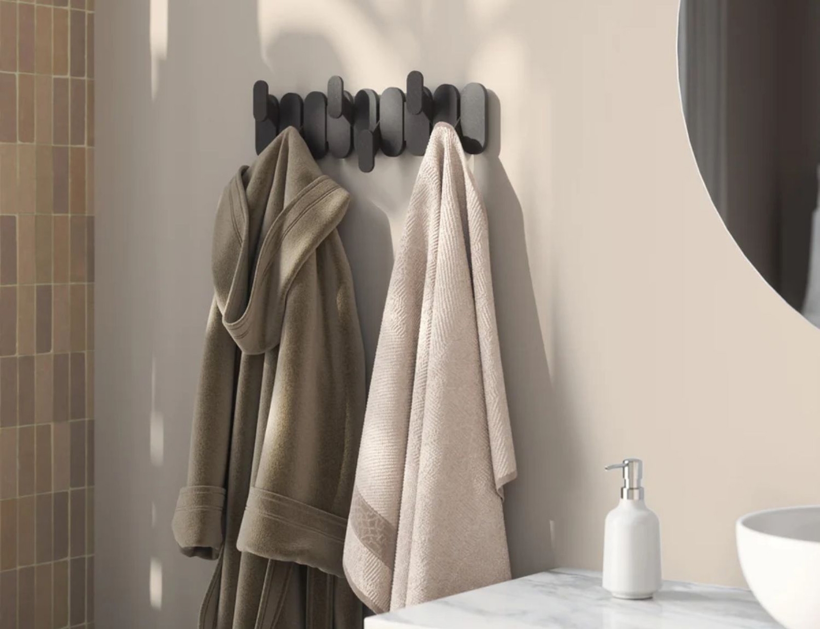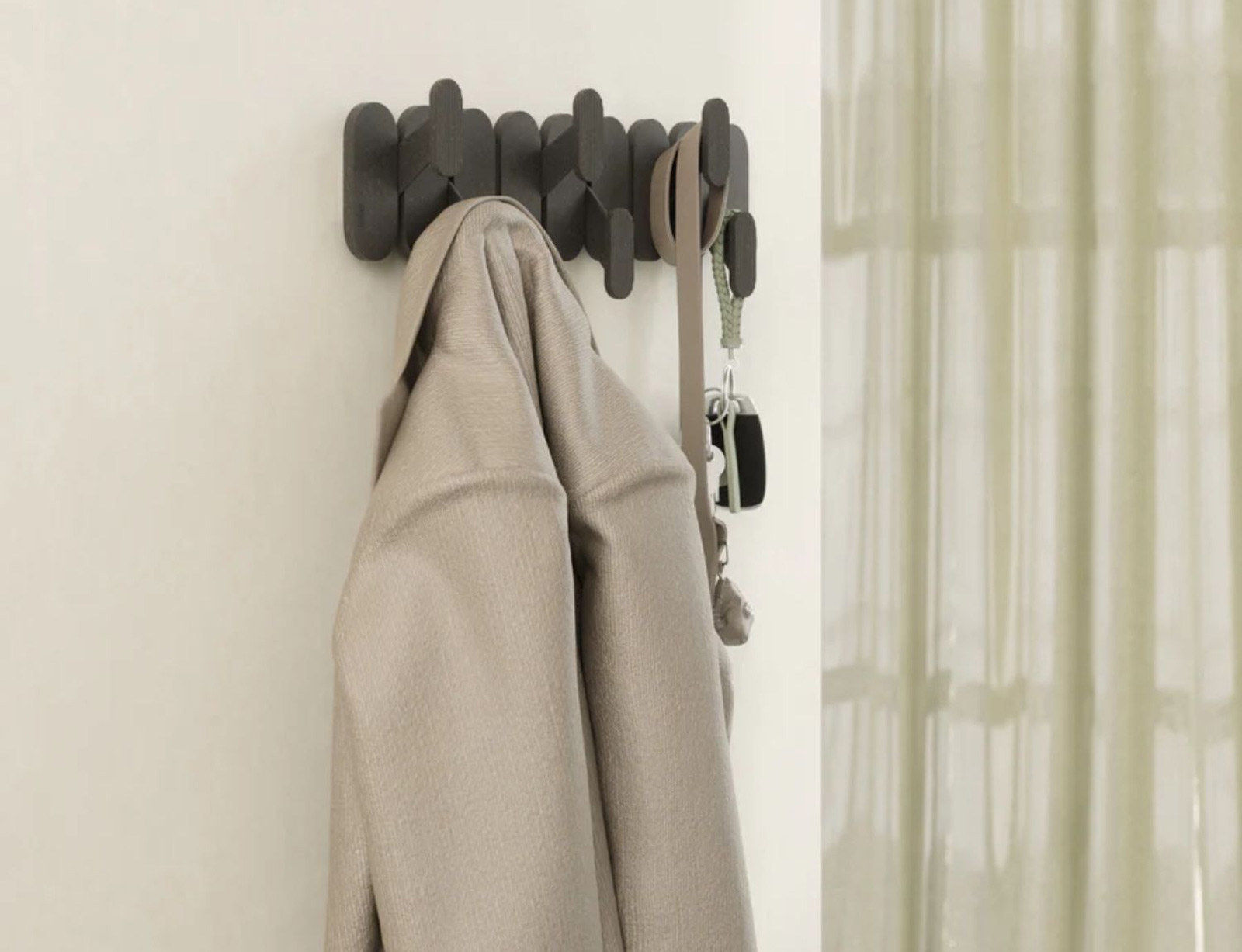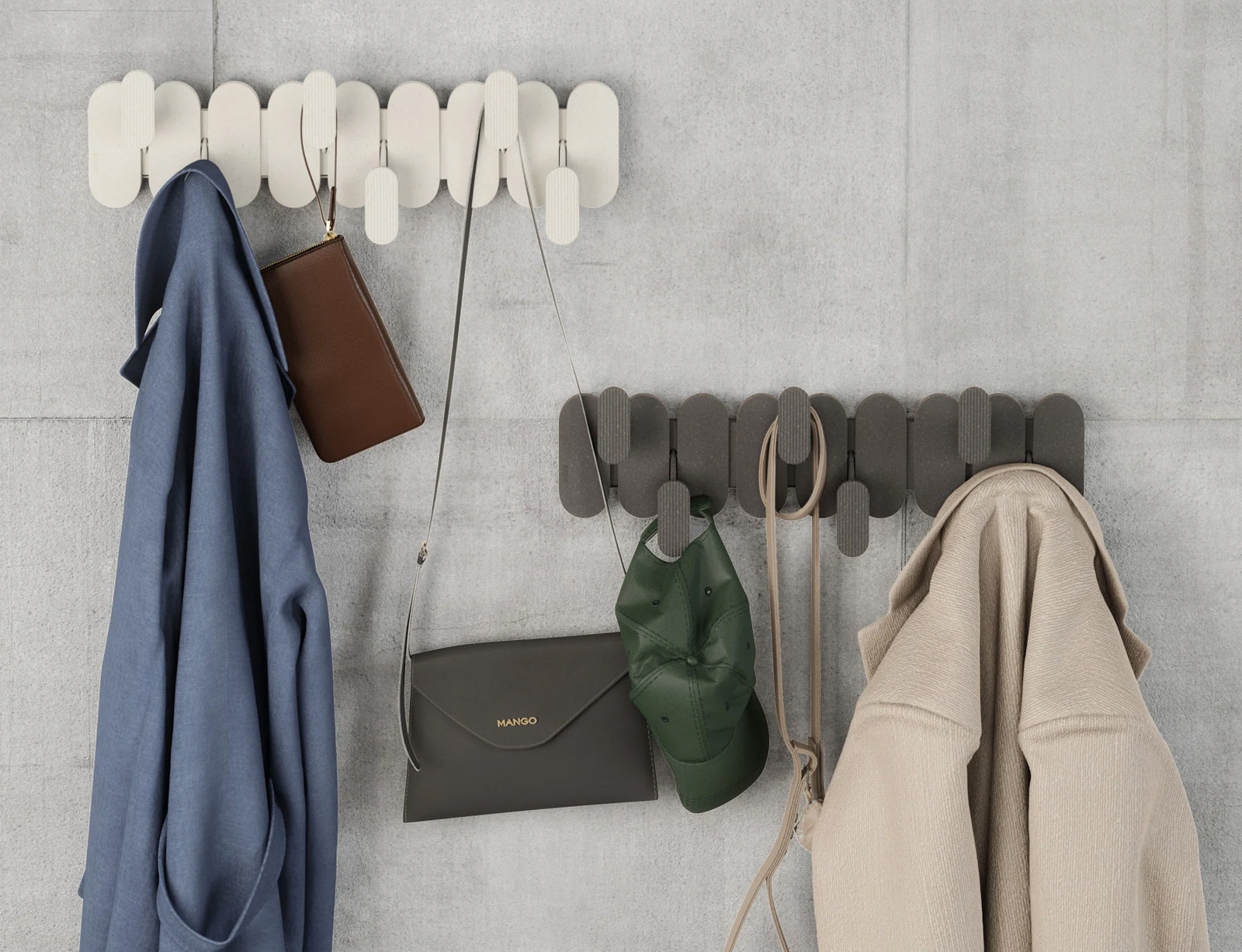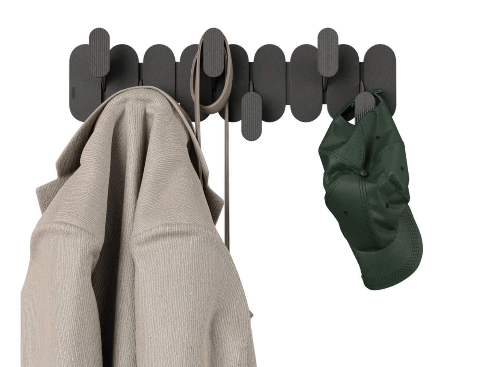 Η κρεμάστρα της σειράς Tempo από την Umbra, συνδυάζει το μοντέρνο στυλ με την καθημερινή λειτουργικότητα. Οι έξι εναλλασσόμενοι γάντζοι της εξοικονομούν χώρο και δημιουργούν ένα εντυπωσιακό, γεωμετρικό εφέ στον τοίχο, ενώ παράλληλα προσφέρουν άφθονο χώρο για το κρέμασμα ρούχων, τσαντών, πετσετών και αξεσουάρ. Κατασκευασμένη από ανθεκτικό, ελαφρύ ανακυκλωμένο πλαστικό αναμεμειγμένο με ανακυκλωμένες ίνες ξύλου, προσφέρει φυσική υφή που ταιριάζει αρμονικά σε κάθε περιβάλλον, από εισόδους και υπνοδωμάτια έως μπάνια και γραφεία.